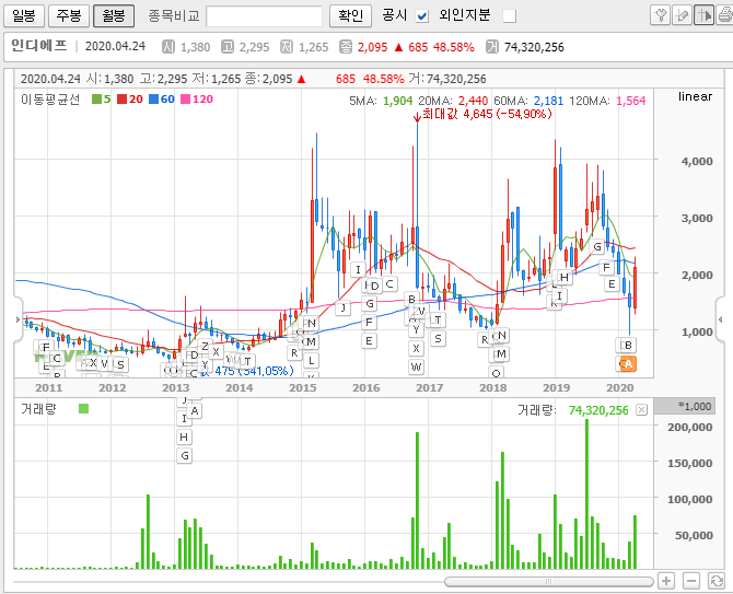 월봉차트에서 인디에프의 주식을 봐도 패턴상 바닥 위치에 있습니다. 그리고 지금의 이슈 외에도 견조한 성장 흐름을 보여주는 종목이라 가능성은 있는 편이라 생각합니다.