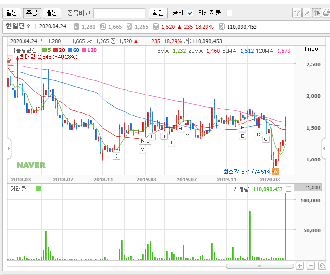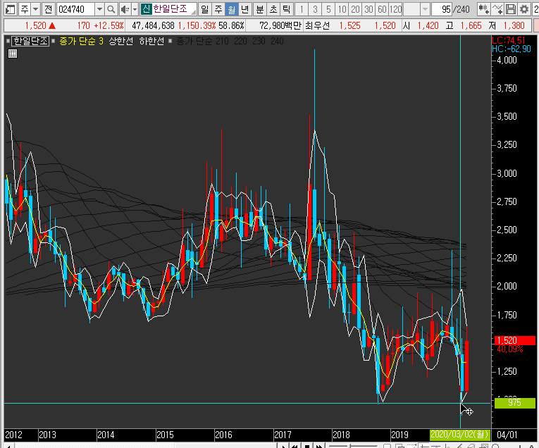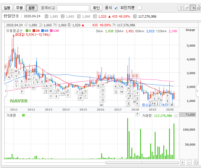 결국 시장성으로 보나 재료로 보나 지금 이 종목은 그리 매력적으로 보이지 않습니다. 그리고 차트로 한일단조의 주가를 봐도 딱히 매력을 찾을 수 없습니다.