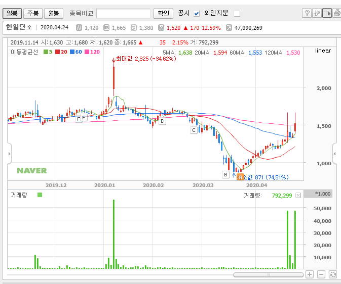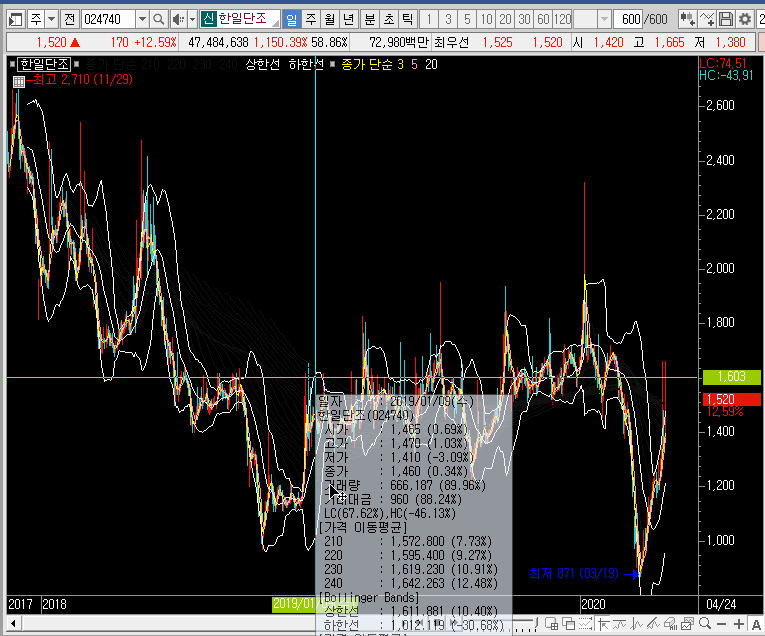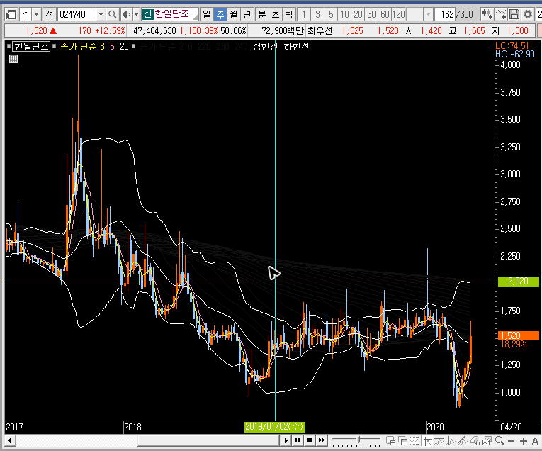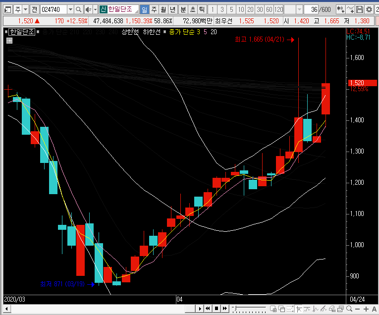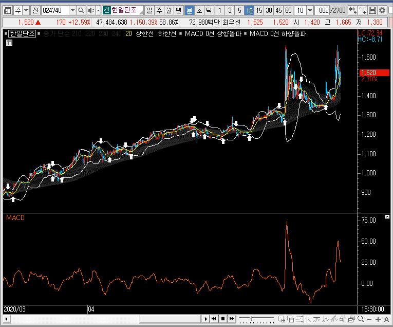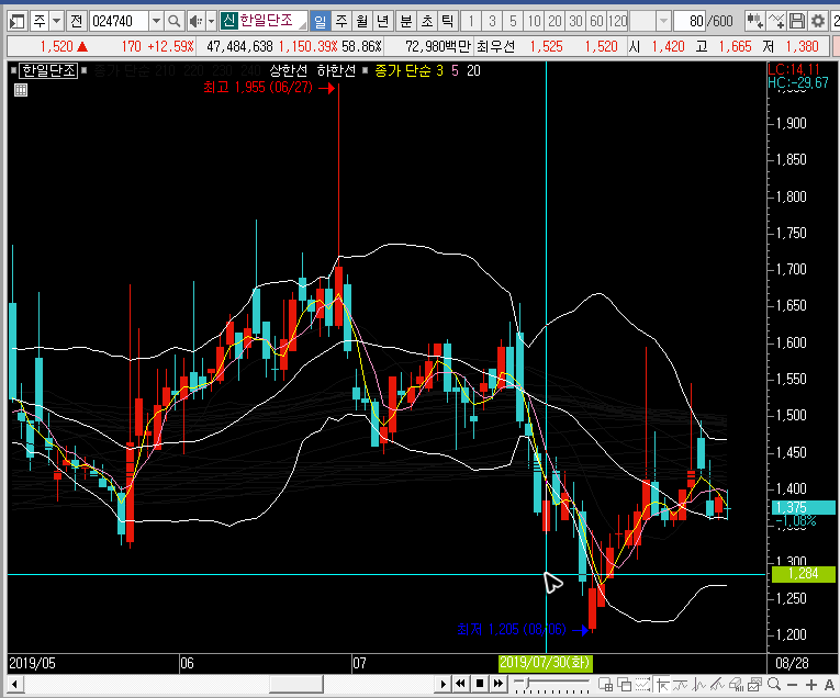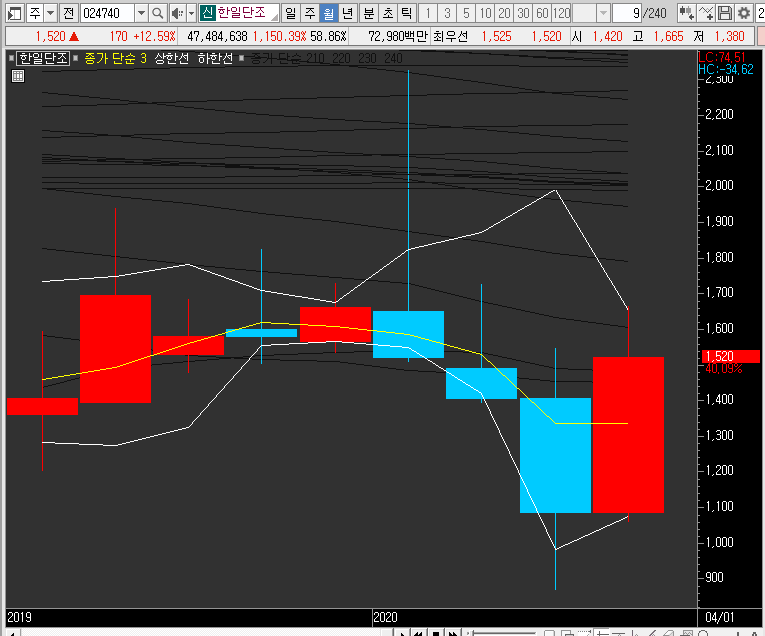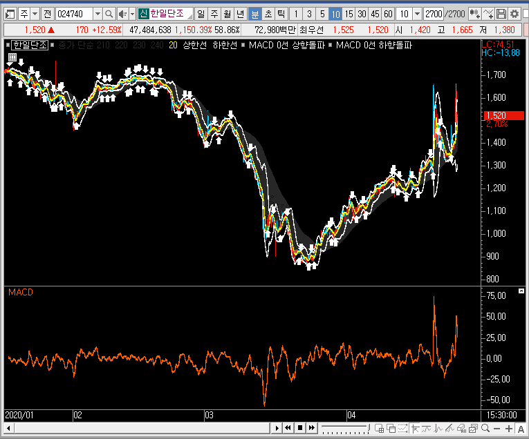 일봉이나 주봉만 보고 있느면 앞으로 한일단조의 주가가 더 큰 상을 보여줄 것 같기도 한데, 큰 의미는 없을 것 같습니다. 실제로 더 큰 상승파가 나온다고 해도 그냥 놓치는 것이 좋을 듯합니다.