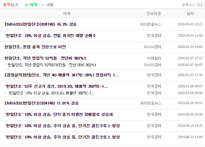 가파르게 상승하는 종목을 어설프게 공략하려고 시도하다 보면 오히려 결과는 나쁜 방향으로 흐를 수 있기 때문입니다. 그리고 결정적으로 한일단조의 주가와 관련된 재료가 그리 좋게 보이지 않습니다.