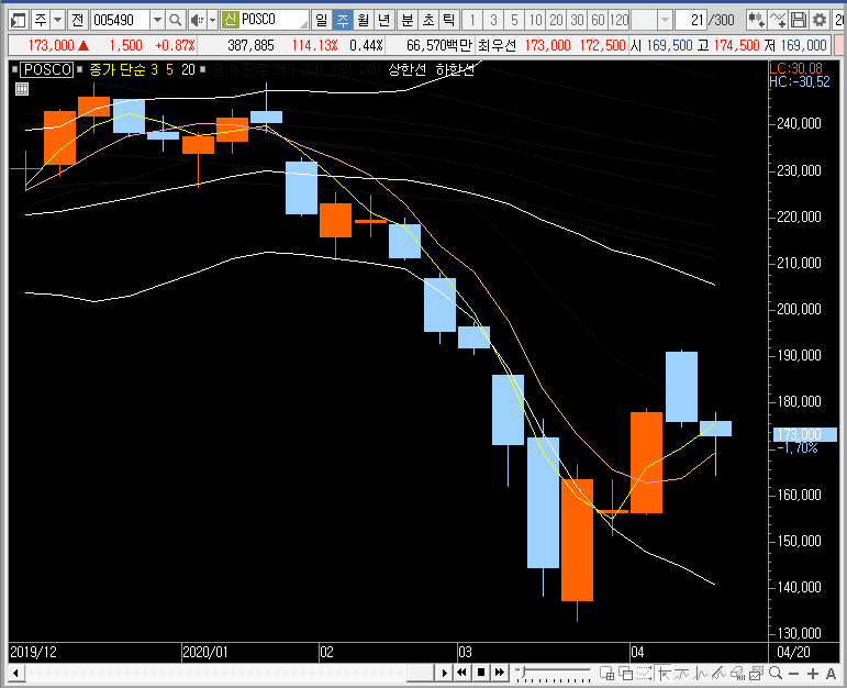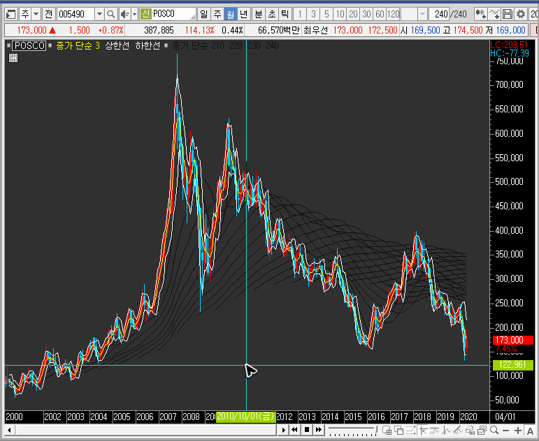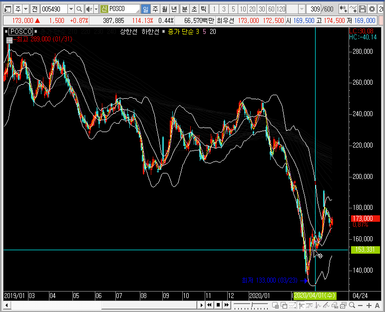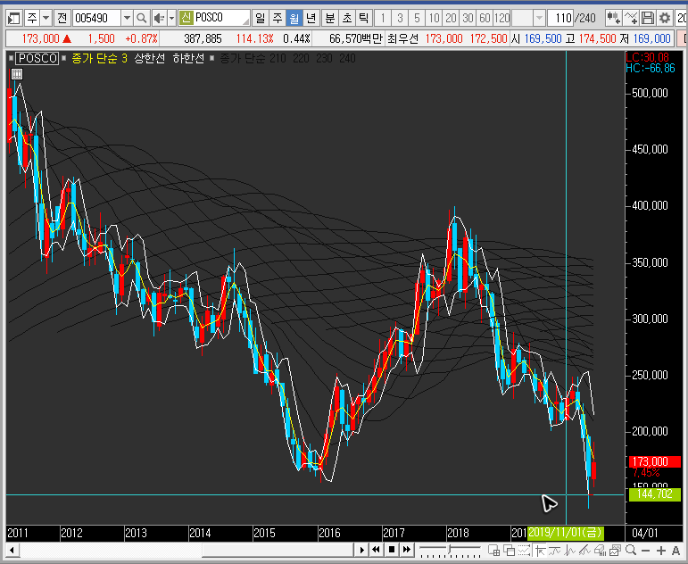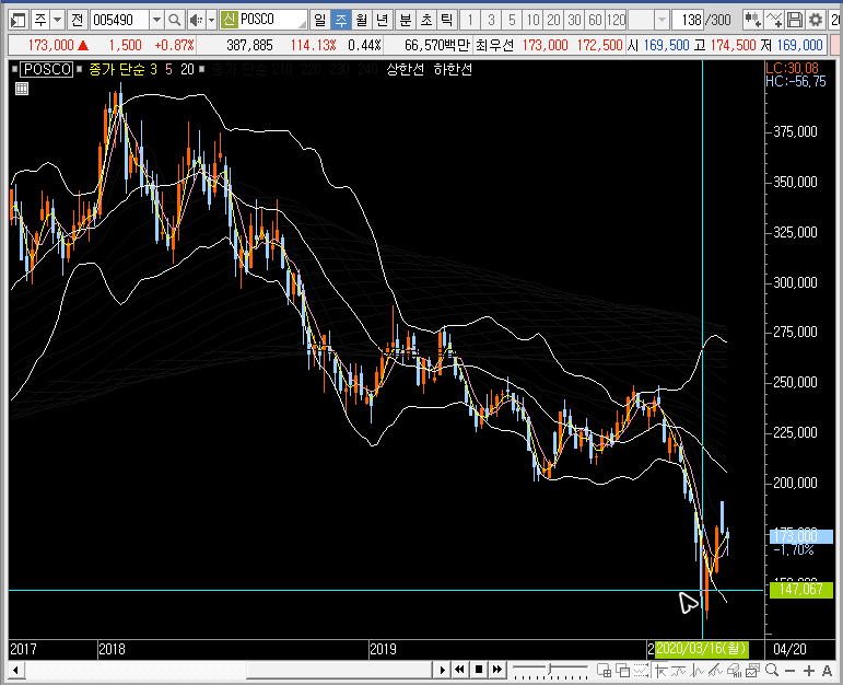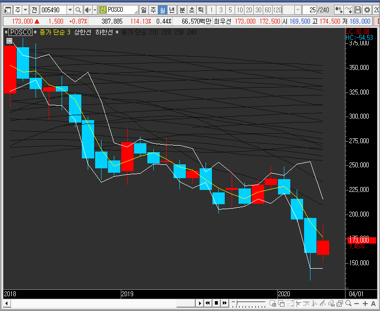 주봉차트의 밴드 하단에서 posco의 주가가 반등하는 모습이 나올 수도 있습니다만, 월봉차트를 확대하면 단기 반등이 하락파를 끝하는 것으로 보기 어려운 상황입니다.