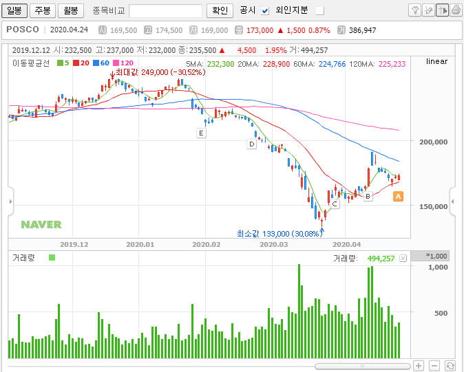 정말 장기적인 관점으로 posco의 주가를 바라보시는 분들이라면, 시기가 언제가 됐든 차분하게 모아가는 전략을 선택할 수 있겠지만, 중기적인 관점이나 단기적인 관점으로 종목을 본다면 굳이 하락하고 있는 종목을 건드릴 필요가 없을 것 같습니다.