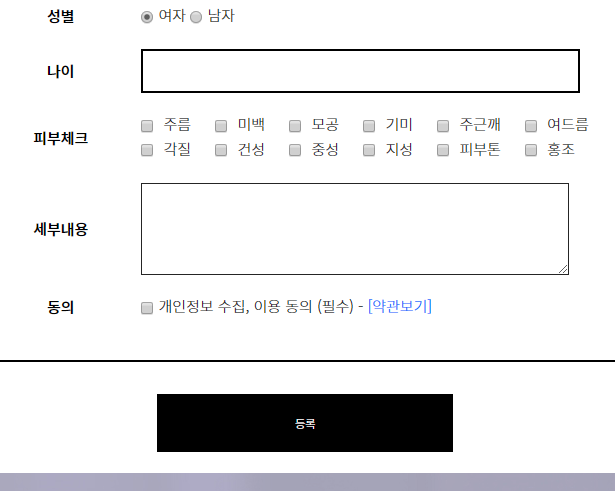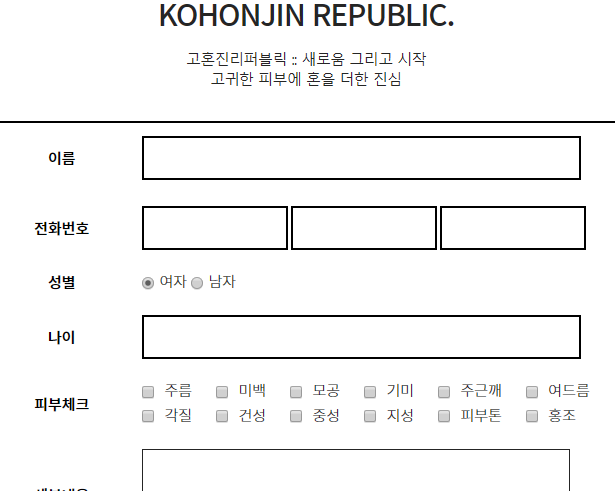 메뉴를 누르면 특별히 페이지 이동을 하는 것이 아니라 스크롤만 움직일 거예요. 그리고 빈칸들이 보이는데, 적당히 빈칸을 채운 뒤에 검은색 버튼을 누르면 고혼진 크림의 가격을 알아보는 정보를 받아볼 수 있을 거예요.
