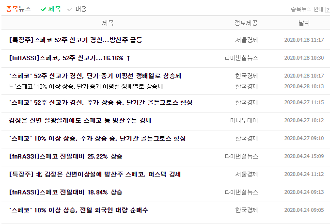 그리고 여느 테마가 그렇듯 소식이 들려온 뒤에 차트를 보면 이미 늦은 경우가 많습니다. 즉, 지금 스페코의 주식에 영향을 주는 재료가 오보가 됐든, 사실이 됐든, 이미 소식이 들려온 시점이니 늦었을 확률이 높습니다.