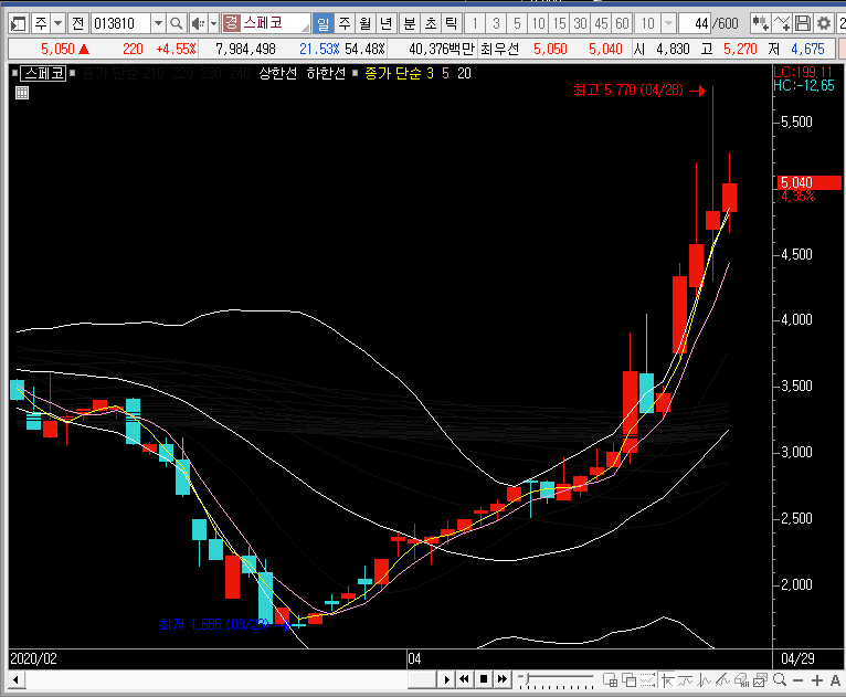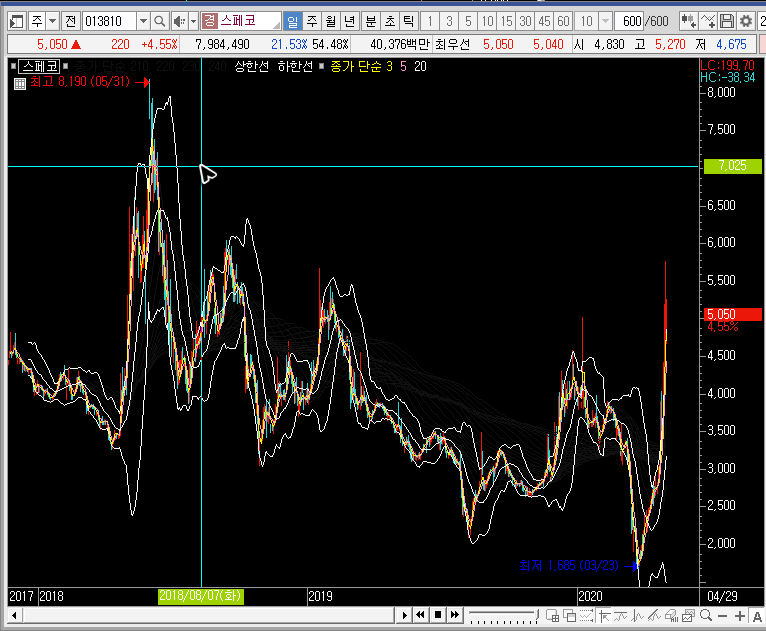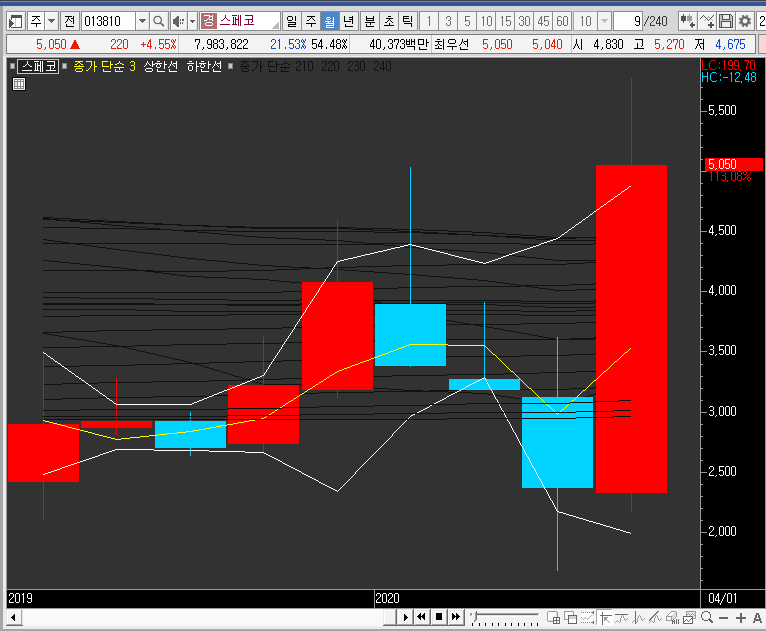 월봉에서 그물망을 뚫어주는 강력한 양봉이 나오기는 했으나, 한 편으로는 너무 많은 스페코의 주식 상승이 있었습니다. 즉, 조정이 들어올 확률을 무시할 수 없는 상황이 되었습니다.