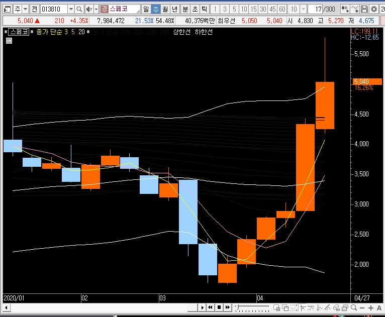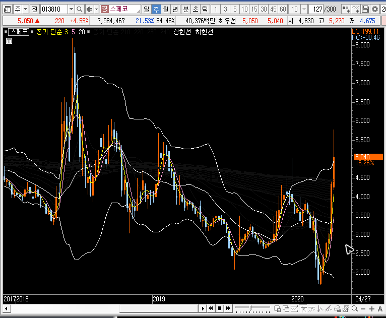 주봉차트에서 스페코의 주식을 봐도 의견이 달라지지 않습니다. 밴드 상단선을 건드린 상황입니다. 그리고 이 상단선은 일차도 아닌 이차 목표에 해당합니다.