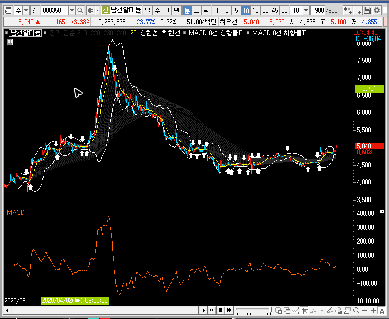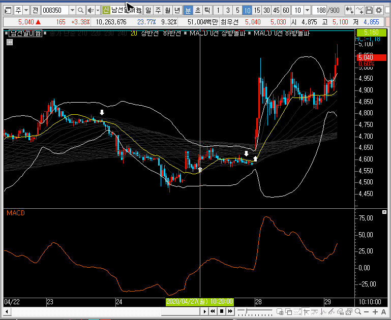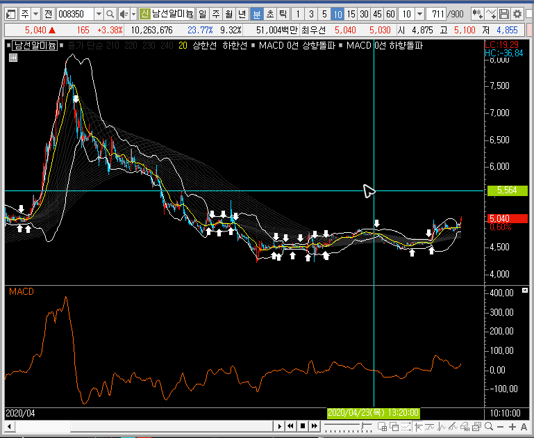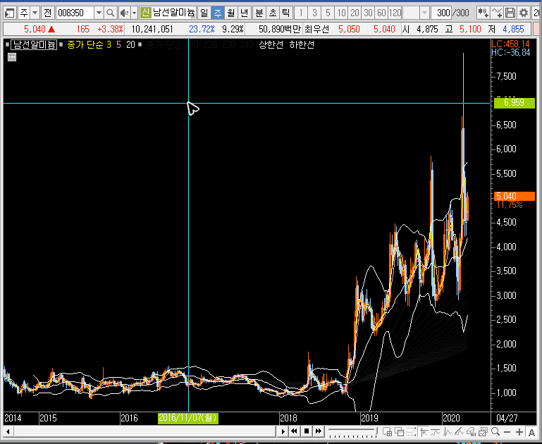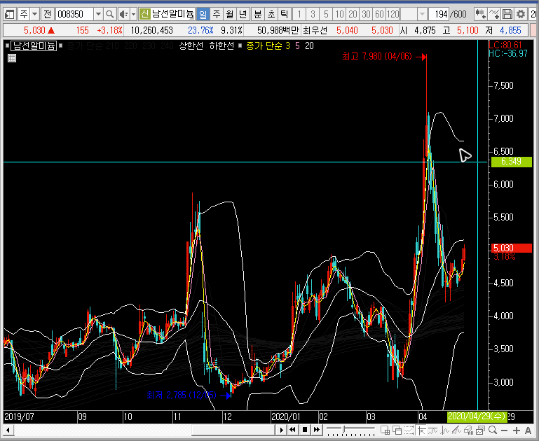 주봉차트를 보면 아직까지 이번 하락파를 통해 중심선도 건드리지 않은 남선알미늄의 주가를 볼 수 있는데, 몇 번이나 중심선을 건드리면서 올라온 종목이니 이제는 밴드 하단선을 기다려보는 것도 나쁘지 않은 선택이 될 것 같습니다.