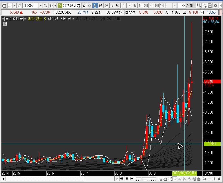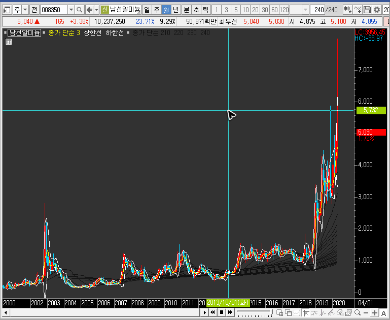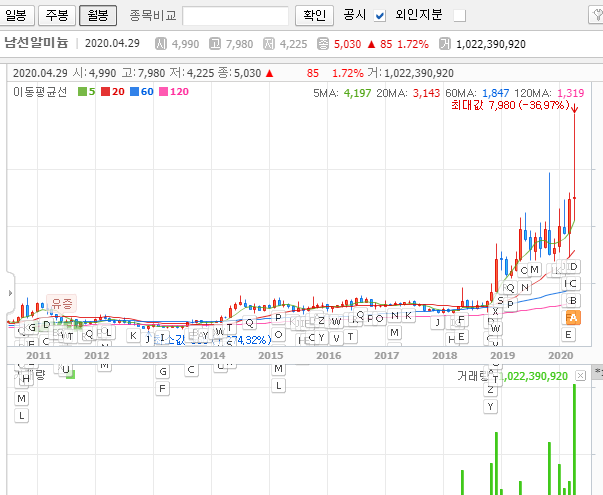 그리고 애초에 이 종목은 실적이 나쁘지 않습니다. 월봉차트를 줄여서 남선알미늄의 주가를 보면 예전에도 꾸준하게 상승추세를 유지하고 있다는 것을 알 수 있죠.