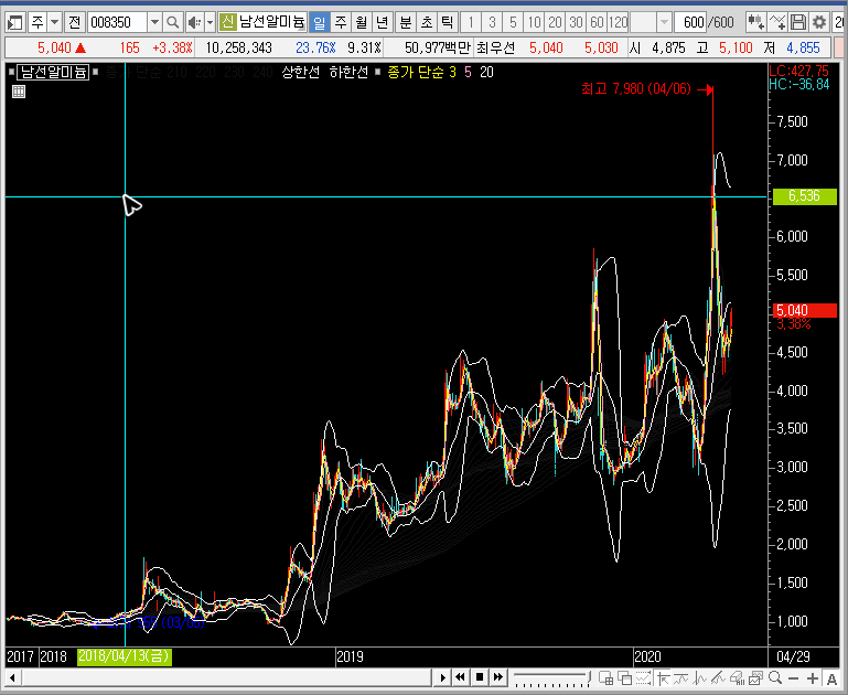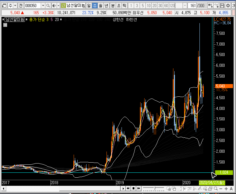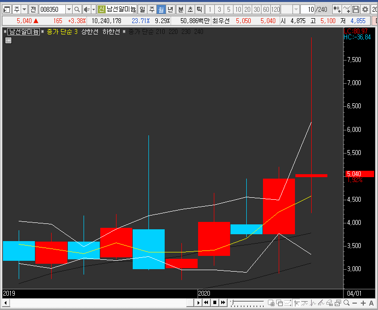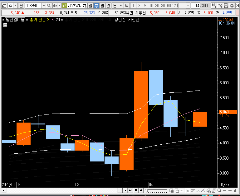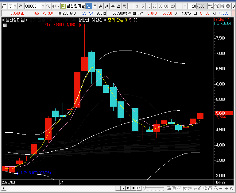 월봉차트에서 이번 달 캔들을 보면 확실히 상식 수준을 벗어나는 크기로 윗꼬리를 만들고 있습니다. 당장에는 남선알미늄의 주가를 공략하는 것이 너무 이른 시기가 될 수 있다는 것이겠죠.