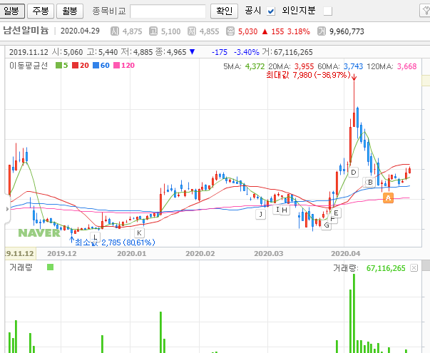 소소한 규모로 시장에 참여하며 겨우겨우 생존하는 일개 개미일 뿐이니, 지금 제가 얘기하는 남선알미늄의 주가에 대한 내용들은 가볍게 봐주시면 좋겠습니다. 사실 틀릴 확률이 높아요.