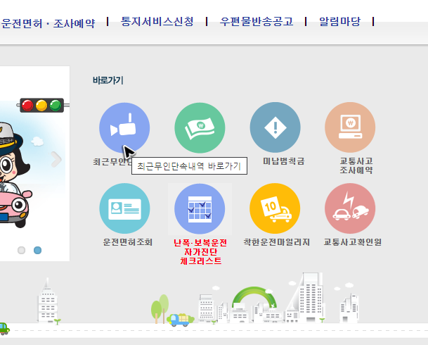 검색하거나 주소를 입력해서 페이지를 찾아가면 몇 가지 메뉴들이 보일 거예요. 우리는 신호위반 실시간 조회를 하기 위해서 찾아온 것이니, 최근무인단속내역이라 적힌 메뉴를 찾아서 클릭하면 됩니다.