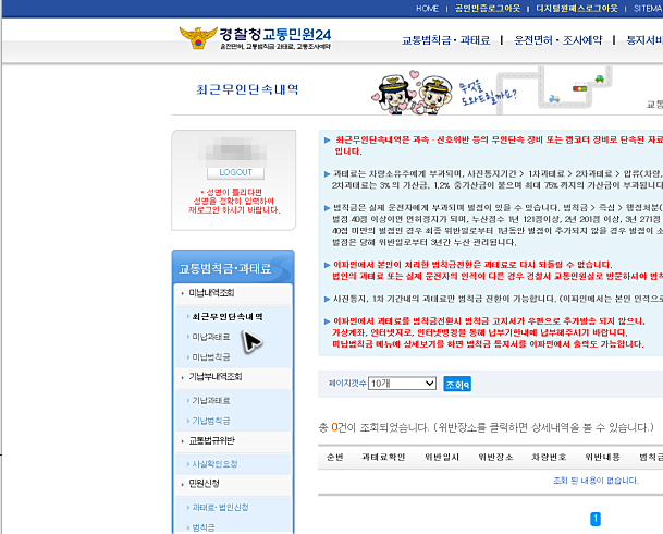 로그인을 했다면 이제 최근무인단속내역을 확인하는 페이지로 이동하실 수 있을 것입니다. 왼쪽에서 신호위반을 조회하는 메뉴가 선택된 것이 맞는지 가볍게 확인해주시고, 오른쪽 하단의 내용을 살펴보시면 됩니다.