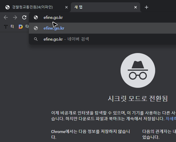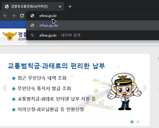 신호위반의 조회를 하려면 우선 이파인 홈페이지를 찾아가야 합니다. 워낙 유명한 사이트라서 검색을 하면 바로 찾아가실 수 있겠지만, 조금 더 빠르게 찾아가려면 그냥 주소창에 [efine.go.kr]를 입력해서 신호위반 여부를 조회하시면 됩니다.