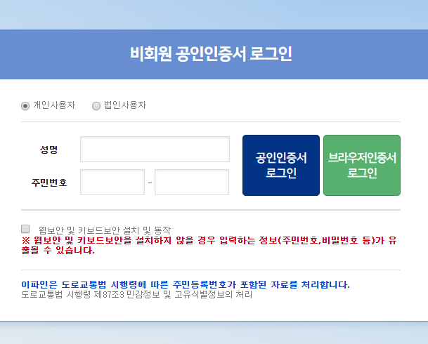 메뉴를 누르면 바로 신호위반을 조회하는 곳으로 이동하는 게 아니라 로그인하는 화면이 나올 거예요. 인터넷을 활용한 실시간으로 정보 조회를 하려면 어쩔 수 없는 부분이니 귀찮아도 로그인을 해주셔야 해요.