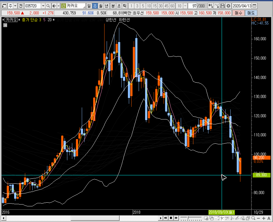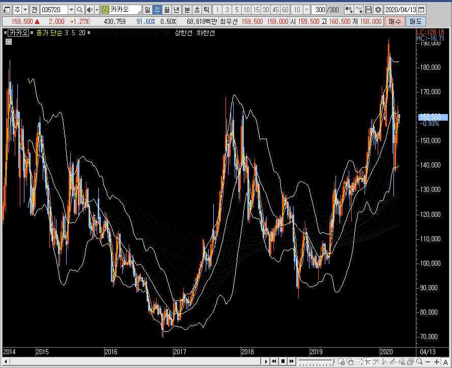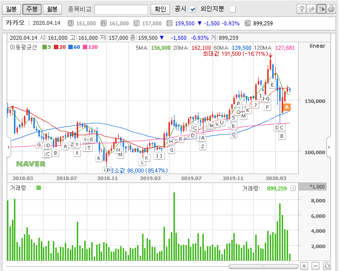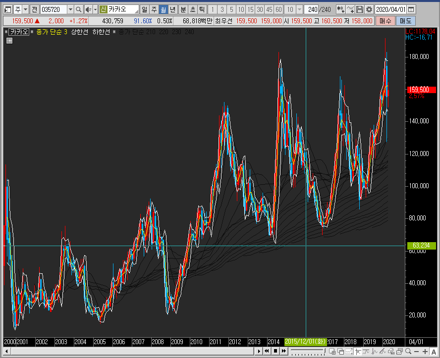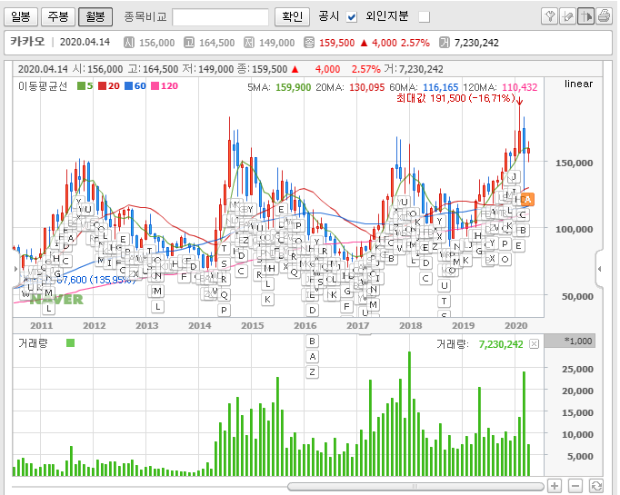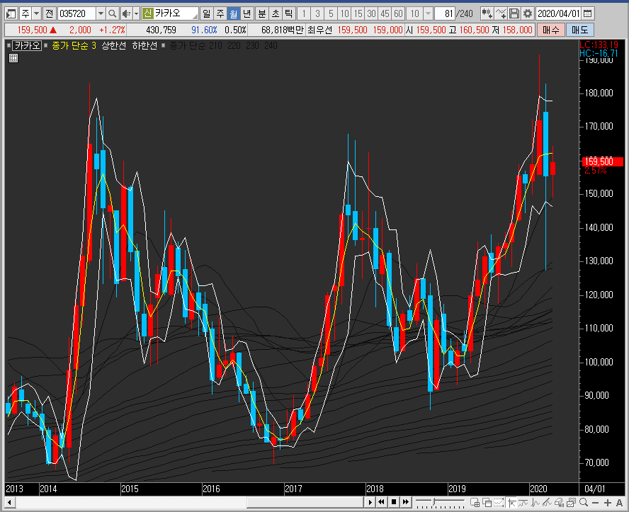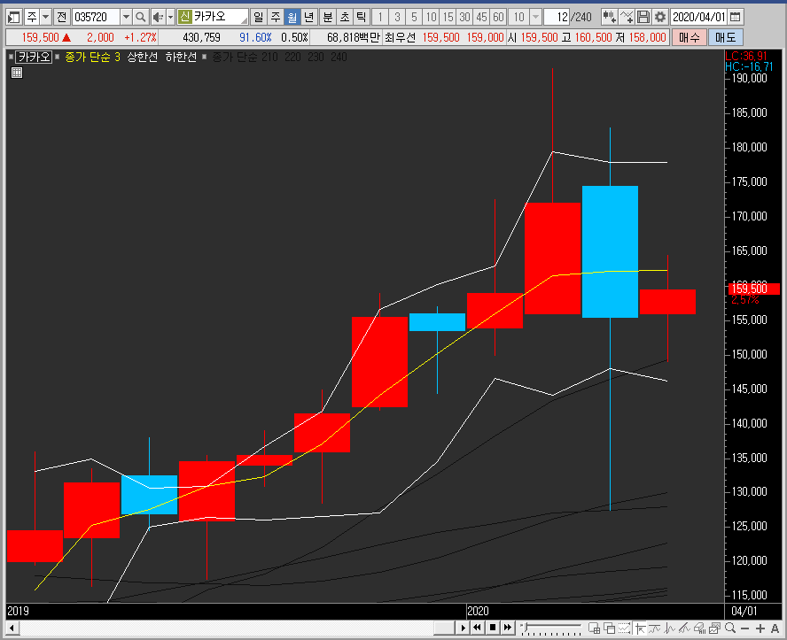차라리 저는 그냥 차트를 보면서 카카오의 주가를 얘기하는 것이 그나마 도움이 될 것 같습니다. 월봉차트에서 최근 흐름을 보면 상당한 상승파를 만들었고, 어려운 시장상황에서 방어도 훌륭하게 해낸 모습을 볼 수 있습니다.