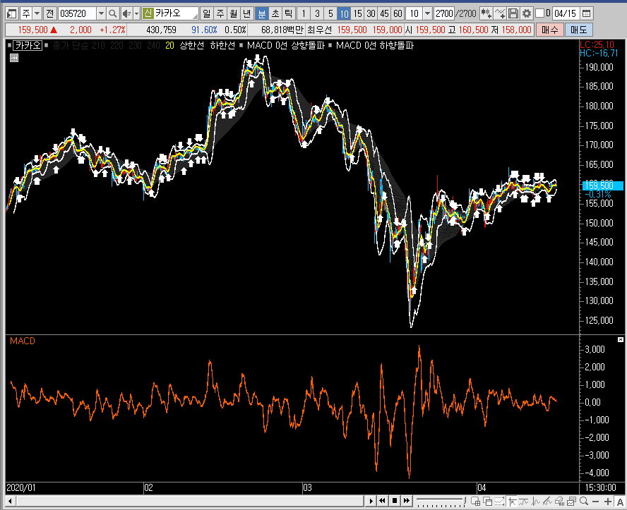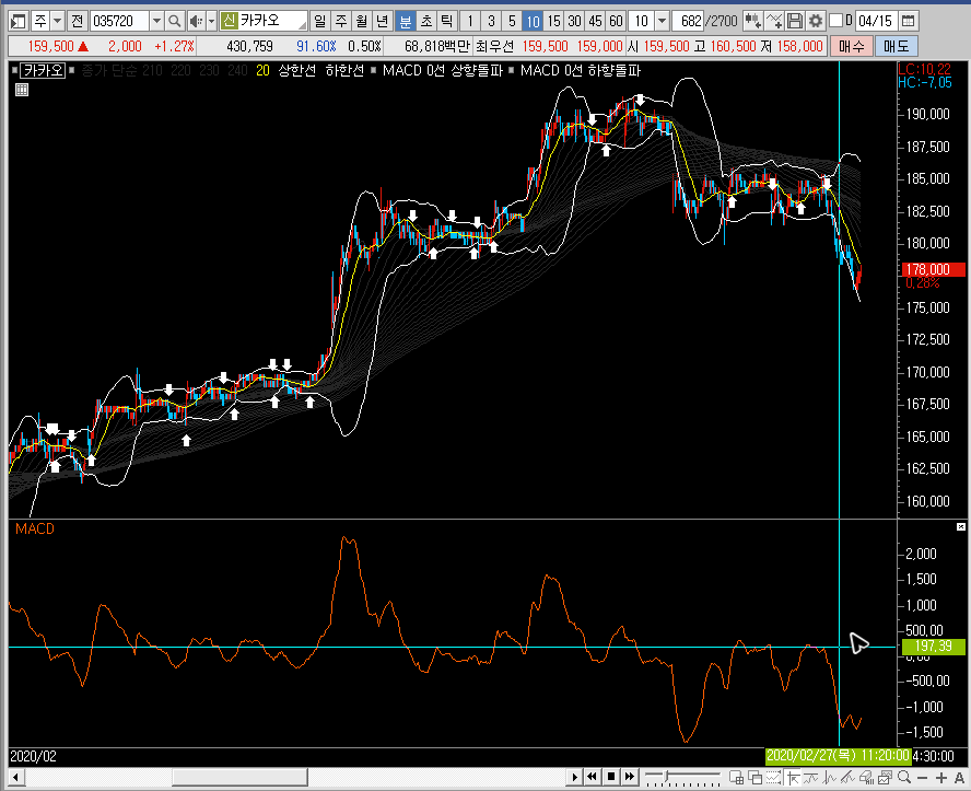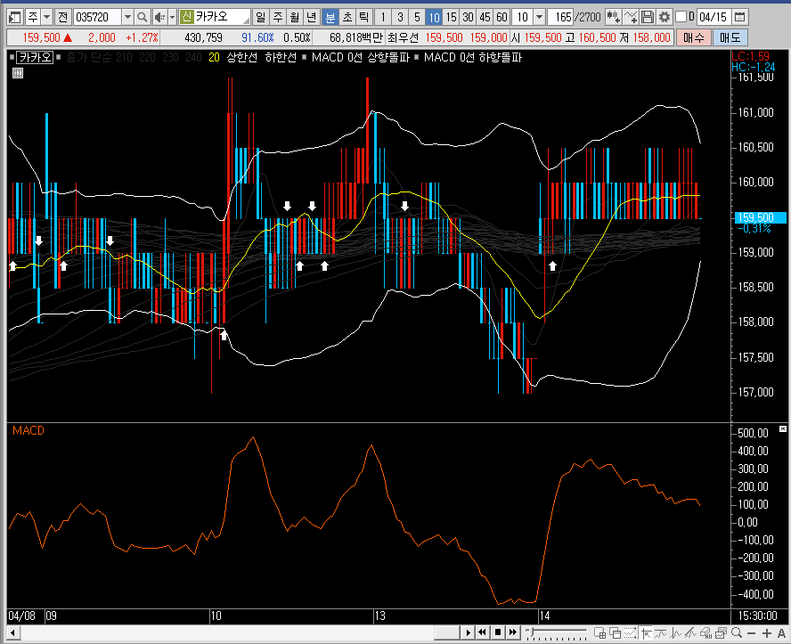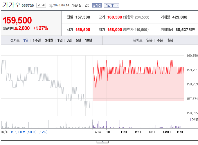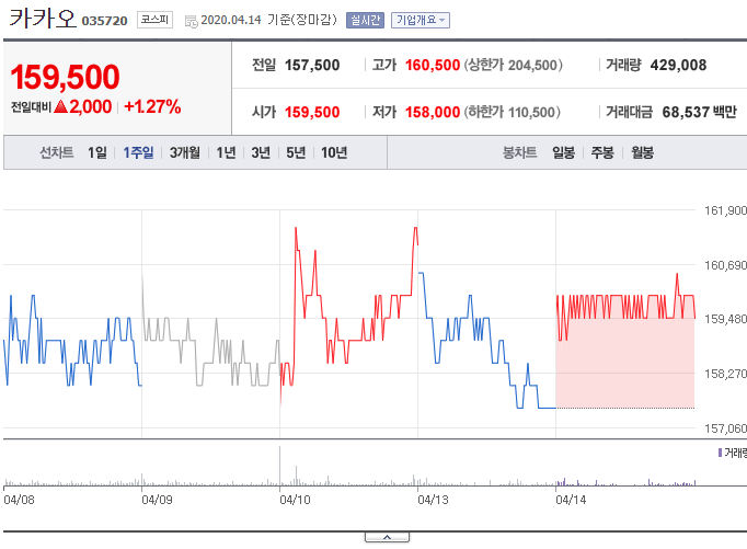 그러니 분봉으로 넘어가서 카카오의 주가를 봐야 할 텐데, 분봉에서는 아직까지 특별한 지지력을 확인할 수는 없지만, 구간으로는 지금이 공략하기 적당한 시점인 것은 맞는 듯합니다.
