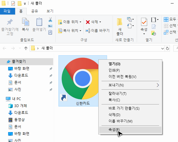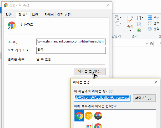 여담으로 바탕화면이나 폴더에 따로 생성한 버튼은 우클릭을 해서 속성을 누르면 아이콘을 변경할 수도 있어요. 편하게 사용을 하려면 신한으로 이어지는 버튼은 신한과 관련된 이미지를 구해서 쓰면 좋겠죠?