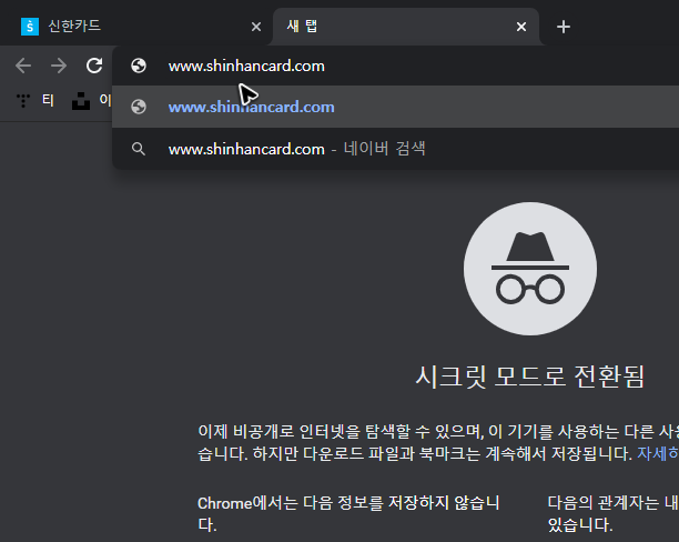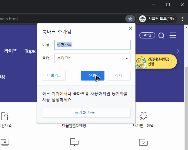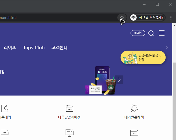 아니면 북마크에 추가해서 신한카드 홈페이지 바로가기를 할 수도 있는데, 마찬가지로 처음에는 신한의 페이지를 띄우고, 그 다음에는 주소창 오른쪽의 별표를 누르면 됩니다.