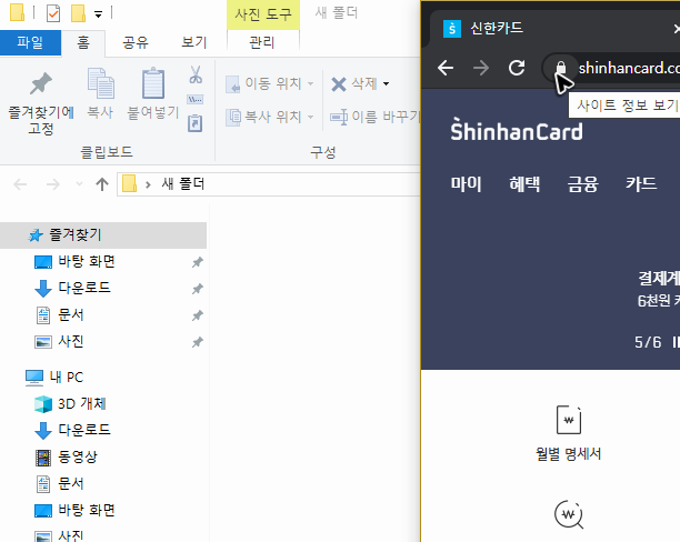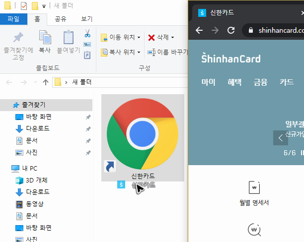 그리고 저처럼 컴퓨터에서 신한카드 홈페이지 바로가기를 하는 경우가 많다면, 아무래도 버튼을 만들어서 홈페이지를 빠르게 찾아가는 것이 편리해요. 혹시 버튼을 만들고 싶으시다면, 그냥 버튼을 보관할 폴더나 바탕화면의 공간을 준비해두고, 브라우저에서 홈페이지를 띄운 뒤에 주소창 왼쪽을 드래그하며 밖으로 꺼내주시면 됩니다.