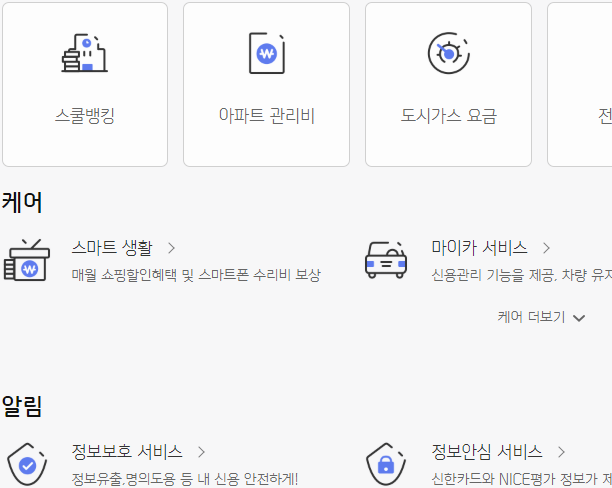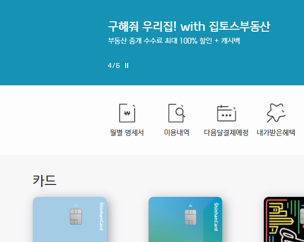 중간 영역을 살펴보면 자주 쓰는 메뉴들이 따로 정리되어 있기도 한데, 많은 분들이 신한카드 홈페이지 바로가기를 했을 때 사용하고 있는 메뉴이니, 이 부분을 살펴보시면서 필요한 기능들을 페이지에서 찾아보셔도 좋을 것 같아요.