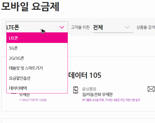 저는 모바일 요금제를 클릭해봤어요. 그랬더니 세부적인 종류들이 있는 페이지로 연결이 되는데, 이 종류도 워낙에 많아서 검색할 수 있는 기능을 지원해주고 있습니다. 평소 사용하는 데이터 유형을 고려해서 유플러스의 요금제를 검색하시고 마음에 드는 종류가 보인다면 클릭해보시면 될 것 같습니다.