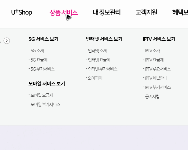 주소를 정확하게 입력해도 유플러스의 요금제 종류가 바로 보이지는 않을 거예요. 그래서 메뉴를 눌러주어야 합니다. 상단 카테고리 영역을 보면 상품서비스라 적힌 부분이 보일 거예요. 그 부분에 커서를 올려주세요. 그리고 드롭되는 메뉴들을 확인하시면 됩니다. 인터넷과 TV, 모바일이 각각 나눠진 상태인데, 필요한 요금의 유형을 클릭하면 됩니다.