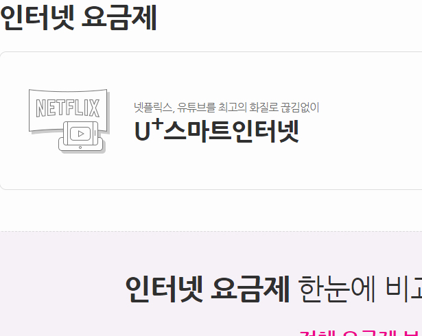 같은 방식으로 인터넷 요금 역시나 메뉴를 누르고 조회를 해볼 수 있습니다. 예전에는 유플러스도 그렇고 다른 곳도 그렇고 인터넷 정도는 그냥 단일 요금제만 있었는데, 요즘에는 인터넷도 다양한 선택폭이 생겨서 좋은 것 같습니다. 한 편으로는 조금 어렵게 느껴진다는 부분이 있기도 하지만, 그래도 유플러스의 요금제에 선택폭이 넓어졌다는 것은 분명 좋은 것이겠죠?