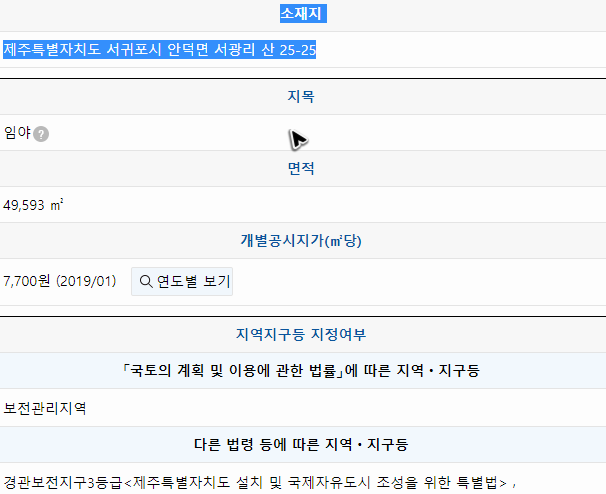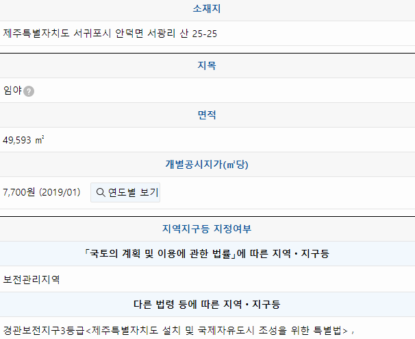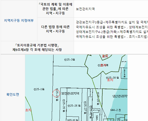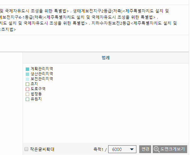 저도 이번에 글을 쓰면서 제주도 쪽에 있는 한 지역의 토지이용계획확인원을 무료열람했습니다. 그랬더니 아래 그림처럼 선택한 토지에 대한 정보들이 나열되는 것을 확인할 수 있었습니다. 이렇게 검색된 결과에서 각각의 항목이 어떤 의미를 담고 있는지 알아두시면 더 좋겠죠?