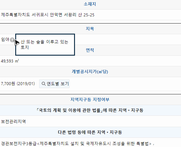 그래서 토지이용계획확인원의 무료열람을 했을 때 나오는 항목에 대해 간략하게나마 얘기를 해보자면, 우선 소재지는 선택한 땅의 위치를 나타냅니다. 검색한 뒤에 내가 지정한 위치의 토지가 맞는지 다시 한 번 체크를 해보시면 될 것 같습니다. 그리고 지목은 토지 용도에 따라 구분된 종류를 의미압니다. 제가 검색한 위치는 임야라 표시가 되는데, 혹시 이런 용어의 의미를 모르겠다면, 토지이용계획확인원을 무료열람했을 때 보이는 항목에서 우측의 물음표에 커서를 올리보면 됩니다.