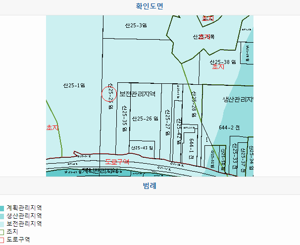 확인 도면은 검색한 땅의 지적과 경계를 도면에 표시해둔 부분이고, 그냥 눈으로 봐도 알 수 있는 부분이니, 토지이용계획확인원을 무료열람하면 바로 살펴보실 수 있을 것입니다.