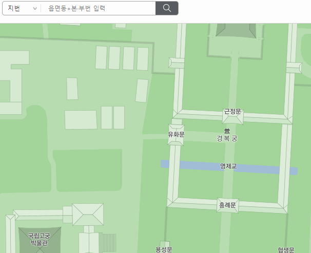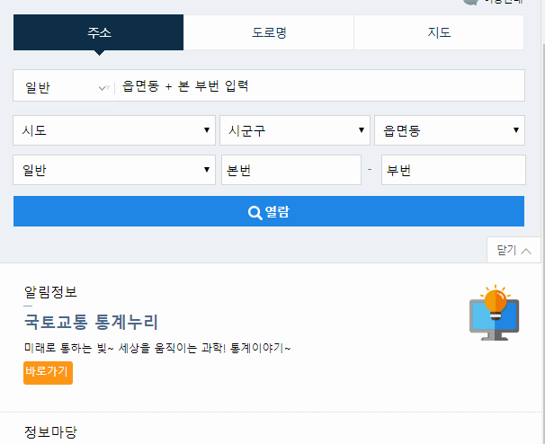 주소를 정확하게 입력했다면, 페이지 중간에 위치를 검색하는 영역이 보일 것입니다. 여기에서 토지이용계획확인원을 무료열람하고 싶은 위치를 선택해주시면 됩니다. 구주소로 검색할 수 있고, 도로명으로 검색을 할 수도 있으며, 지도에서 위치를 지정하면서 검색할 할 수도 있습니다. 특별히 정답이 있는 부분은 아니기 때문에 기호에 따라 땅 위치를 검색하시면 될 것 같아요.