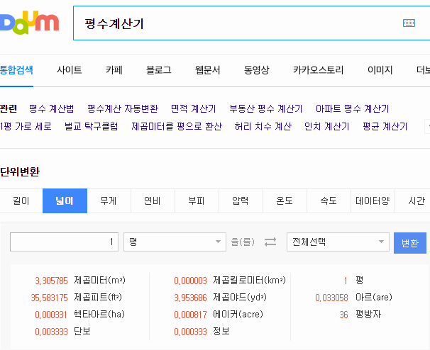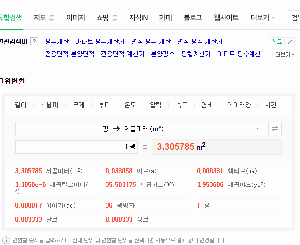 그리고 토지이용계획확인원의 무료열람을 했을 때 나오는 세 번째 항목은 면적인데, 이 부분은 따로 얘기를 할 필요가 없겠죠? 단위를 보면 제곱미터로 표시되어 있는데, 1제곱미터는 약 0.3025평이니, 직접 계산을 해볼 수도 있겠지만, 사실 요즘에는 평수 계산을 해주는 계산기가 많아서 그냥 평수로 변환했을 때 값이 궁금할 땐 계산기를 활용하는 것을 권장합니다.