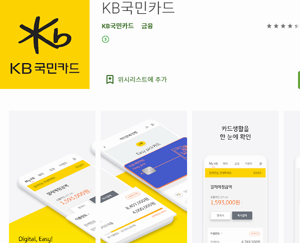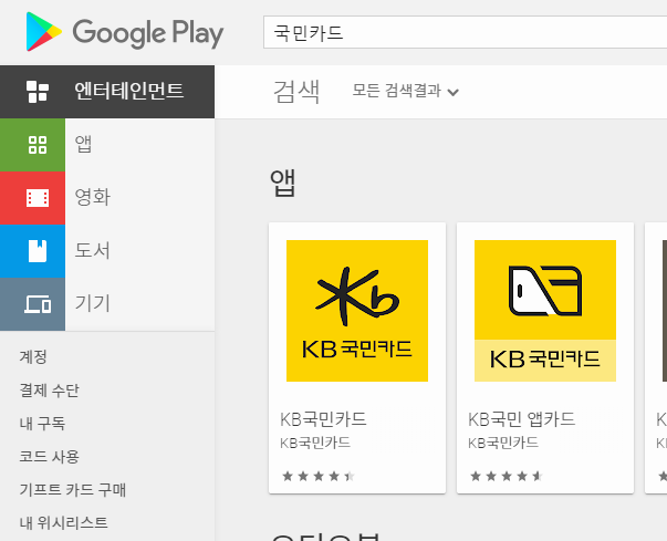 그리고 혹시 평소에 컴퓨터가 아니라 스마트기기로 금융업무를 처리하는 경우가 많다면, 이렇게 홈페이지를 찾아가지 않고 그냥 어플을 설치해서 금융업무를 처리할 수도 있습니다. 플레이스토어를 열고 국민카드를 검색해보면 몇 가지 종류의 어플들이 나오는데, 이 중에서 첫 번째 항목을 선택해서 설치하면 금융업무를 보는데 사용하실 수 있어요.