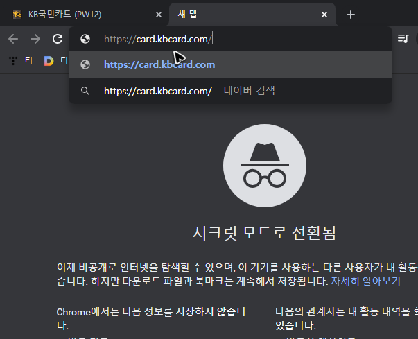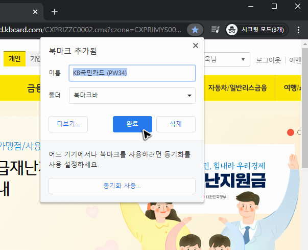 아니면 이렇게 밖에서 버튼을 따로 만드는 것이 아니라 국민카드 홈페이지의 바로가기를 할 수 있는 북마크 버튼을 브라우저에 추가하는 방법도 있습니다. 주소창 오른쪽에 있는 별표 모양을 눌러서 즐겨찾기 목록을 구성할 수 있는데, 크롬이 됐든, 익스플로러가 됐든, 엣지가 됐든, 만드는 방법은 모두 동일해요.