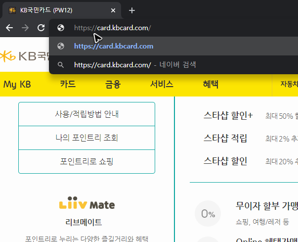 카드사용내역 조회가 됐든, 금융 상품이나 국민카드 포인트 사용처를 알아보는 것이 됐든, 일단 제일 먼저 해야 할 일은 홈페이지를 찾아가는 것인데, 워낙 큰 곳이라 포털에서 검색하면 바로 사이트를 찾아낼 수 있겠지만, 검색은 귀찮은 감이 있어요. 그러니 주소창에 [card.kbcard.com/]를 입력해서 국민카드의 홈페이지로 바로가기를 해주시기 바랍니다. 주소를 입력할 땐 [https]까지 모두 입력해주셔야 해요.