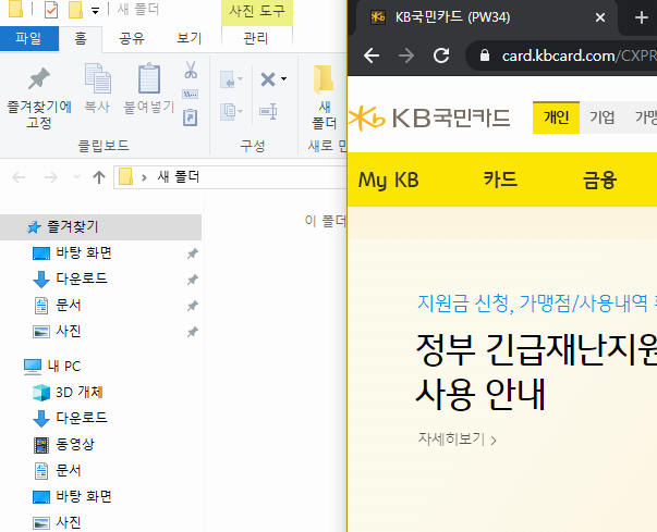 그리고 평소 국민카드 홈페이지의 바로가기를 자주 하신다면, 아무래도 버튼을 만들어서 홈페이지를 찾아가는 것이 수월합니다. 문제는 어떻게 버튼을 만드느냐는 것인데 정말 간단해요! 우선 띄워둔 브라우저의 창 크기를 조금 줄여주세요. 바탕화면이 조금이라도 보이는 상태로 줄여주시면 됩니다.