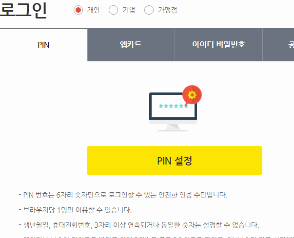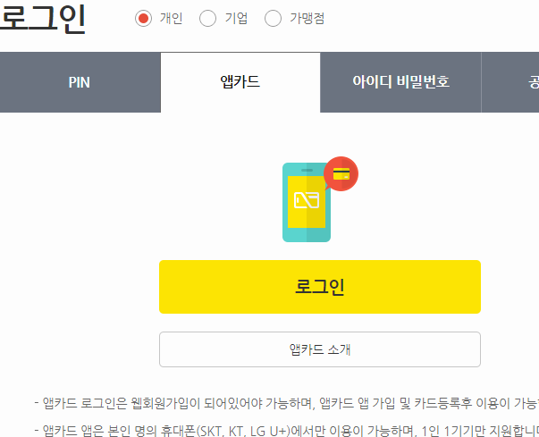 메뉴를 누르면 선택한 항목의 조회 화면이 바로 나오는 것이 아니라 로그인 화면부터 나올 거예요. PIN, 앱카드, 아이디, 공인인증서 등, 총 네 가지 방식으로 로그인을 할 수 있도록 기능을 지원해주고 있는데, 본인 확인을 위한 당연한 과정이니 국민카드 홈페이지의 바로가기를 한 뒤에는 귀찮더라도 로그인을 해주셔야 합니다.