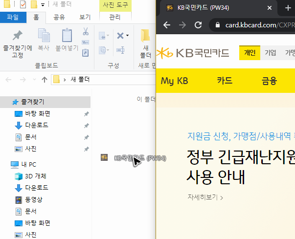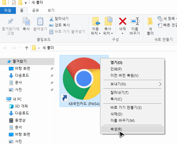 바탕화면이 보일 정도로 창크기를 줄인 뒤에는 주소창 왼쪽 부분에 커서를 올려주세요. 그리고 드래그하며 바탕화면이나 폴더로 꺼내주면, 해당 위치에 국민카드 홈페이지의 바로가기 버튼이 만들어지게 됩니다. 그리고 앞으로는 이 버튼을 실행하면 바로 홈페이지를 띄울 수 있을 거예요. 여담으로 아이콘을 우클릭하고 속성을 누르면 아이콘 변경도 가능한데, 기왕이면 국민카드와 관련된 이미지로 연결을 해두면 좋겠죠?