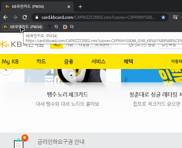 그리고 저처럼 크롬을 사용하신다면 키보드에서 [Ctrl + Shift + B]를 눌러서 국민카드 홈페이지의 바로가기를 하는 버튼을 불러올 수 있습니다. 익스플로러는 [Alt + A]를 누르거나 [Alt + C]를 눌러서 버튼을 불러올 수 있는데, 다른 브라우저는 저도 잘 모르겠어요. 하지만 우측 상단에 있는 설정 메뉴를 보면 모든 브라우저가 북마크에 대한 메뉴가 있으니, 그 버튼을 눌러서 국민카드 홈페이지의 바로가기를 하실 수 있을 것입니다.