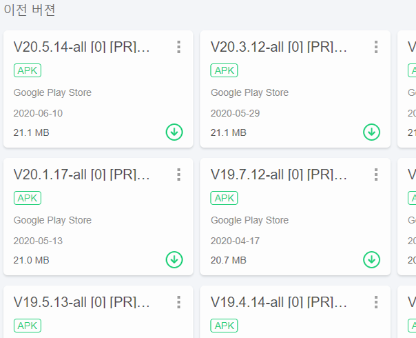 좌우간, 항목을 누르고 또 한 번 페이지 이동을 했다면 구글 플레이 스토어를 설치할 때 필요한 파일을 받는 버튼이 보일 거예요. 초록색으로 된 버튼을 누르면 최신 버전이 받아지는데, 혹시 구버전을 찾고 있으시다면, 버전이라 적힌 버튼을 눌러서 필요한 버전을 따로 선택하시면 됩니다.