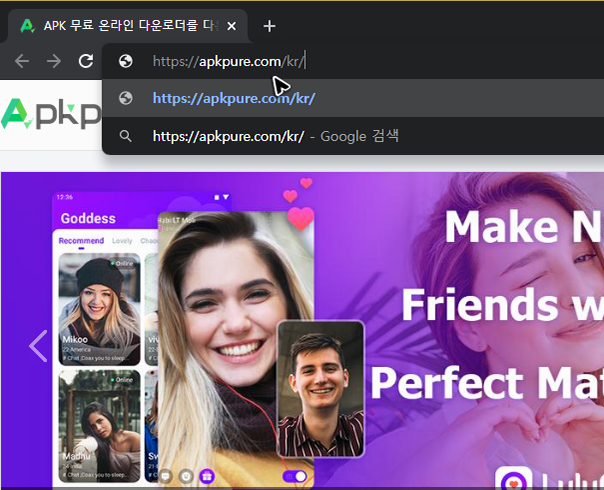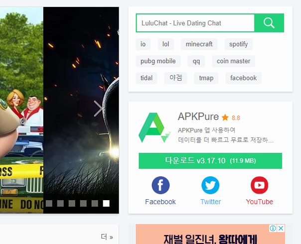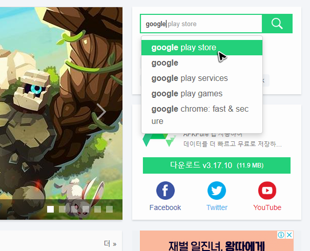먼저 얘기할 수 있는 곳은 퓨어APK인데, 워낙 유명한 곳이라 아시는 분들도 많으실 것 같아요. 물론 안드로이드 앱 store apk의 검증도 이뤄지는 곳이기 때문에 안심하고 쓸 수 있는 자료실 입니다. 주소는 [apkpure.com/kr/]이며, 검색해서 구글의 플레이 스토어를 설치하고 다운하는 페이지로 이동하실 수도 있어요.