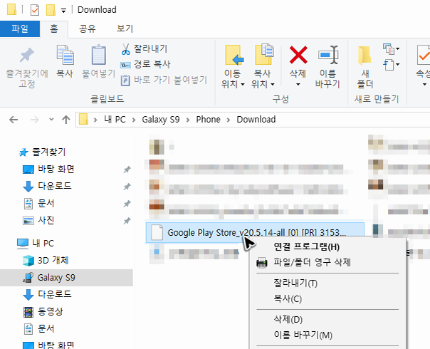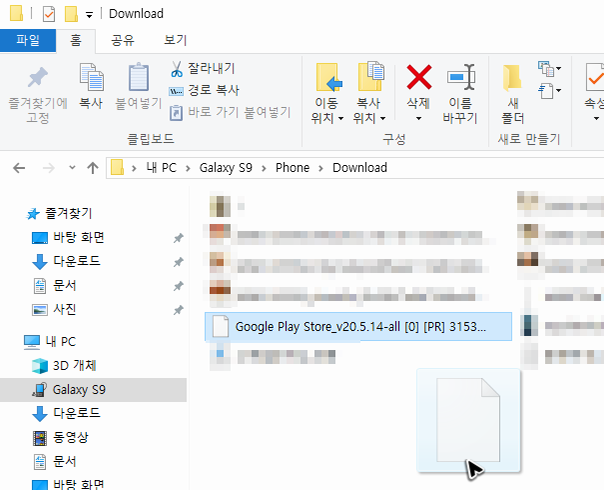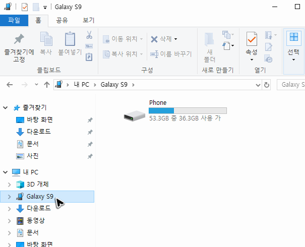 이제 파일을 받았으니, 이 파일을 스마트기기로 옮겨서 실행을 해주어야 해요. 작업해야 할 스마트기기를 PC와 usb로 연결을 하고 탐색기를 실행한 뒤에 스마트기기의 폴더로 진입을 해주세요.