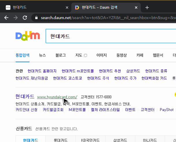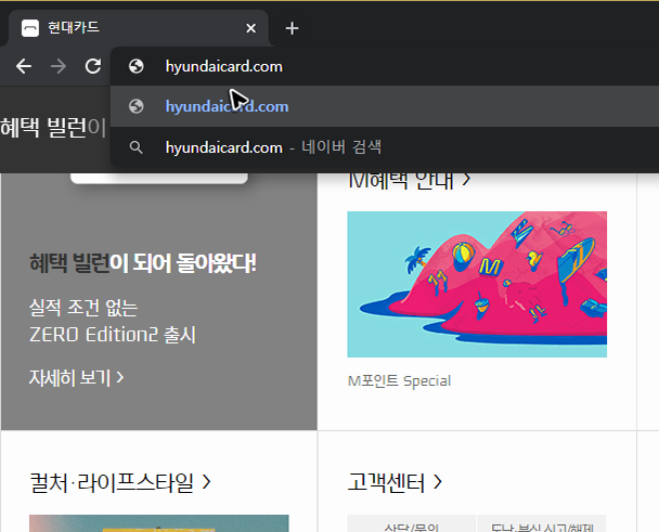 비밀스럽다거나 어둠의 성격(?)을 갖고 있는 사이트가 아니죠? 고로 포털에서 검색하면 빠르게 사이트를 찾아서 접속할 수 있습니다. 하지만 검색한다는 것이 귀찮을 수 있어요. 그러니 주소창에 [hyundaicard.com]를 입력해서 현대카드의 홈페이지로 바로가기하고 버튼을 만들 준비를 해주세요.