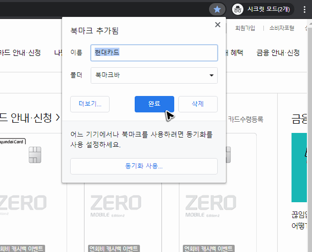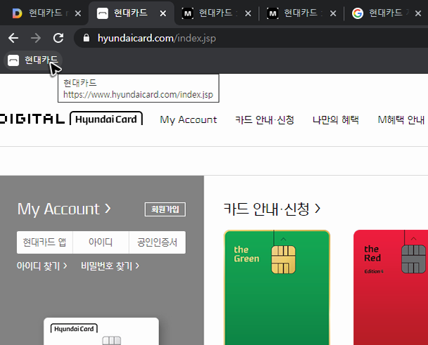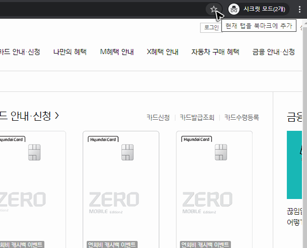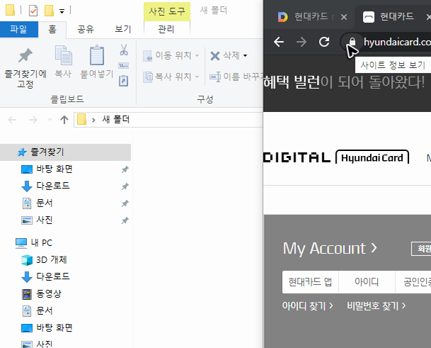 아 참, 두 가지 방법이 있다고 얘기를 했는데 한 가지 방법만 적어두었군요. 혹시 다른 방법으로 현대카드 홈페이지를 빠르게 실행하고 싶으시다면, 브라우저 창 크기를 조금 줄여서 바탕화면이나 폴더가 보이도록 해주세요.