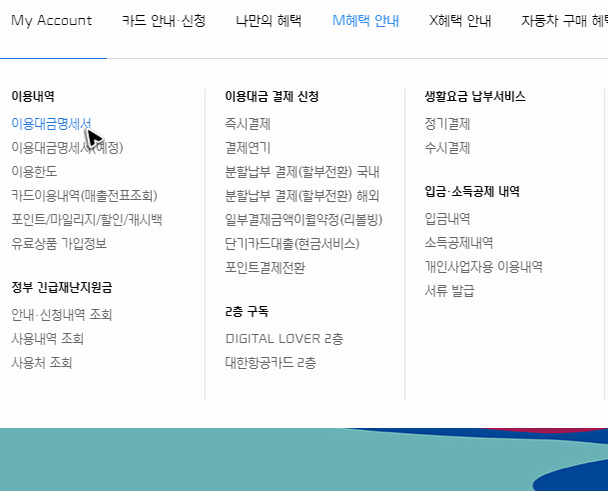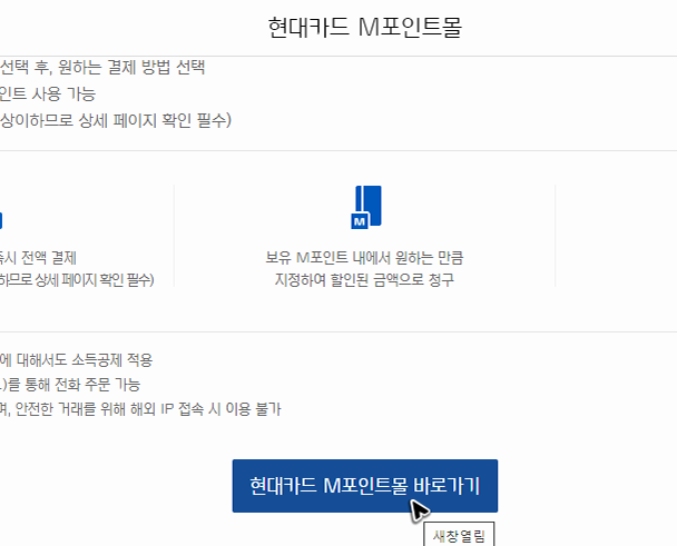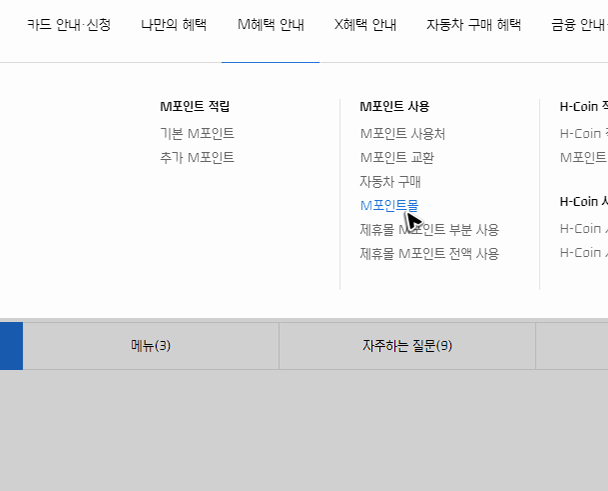아마 많은 분들이 현대카드 홈페이지의 바로가기를 하는 이유 중에 하나가 M포인트몰을 사용하기 위함일 것입니다. 혹시 M포인트몰을 쓰고 싶으시다면 카테고리 메뉴에서 M혜택 안내에 커서를 올려주세요. 그럼 M포인트몰로 이동하는 메뉴를 확인하실 수 있을 것입니다.