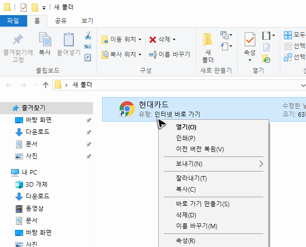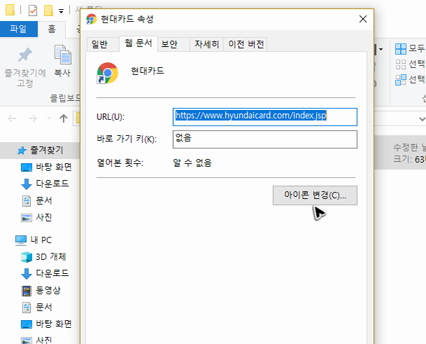 아이콘 하나만 있을 땐 문제가 없는데, 혹시 여러 개의 사이트를 대상으로 아이콘을 만드신다면, 각각의 아이콘을 구분하기 쉽도록 우 클릭을 해서 아이콘 모양 변경을 해주는 것이 좋습니다. 물론 현대카드 홈페이지를 여는 아이콘은 관련 모양을 선택하면 되겠죠?