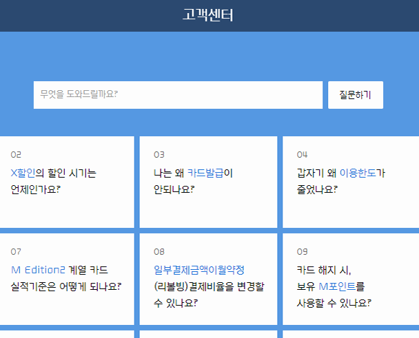 그리고 사용 내역 조회나 신청 및 해지, 분실신고 등의 업무를 보는데 어려움이 생긴다면, 고객센터를 활용하면 됩니다. 사이트 하단에는 유선으로 물어볼 수 있는 경로가 있고, 우측 상단에는 사이트에서 정보를 확인할 수 있는 고객센터 메뉴가 준비되어 있어요.